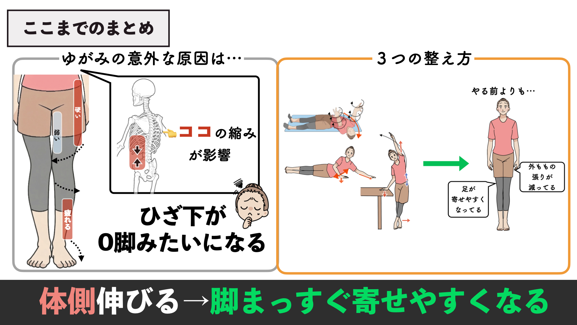 膝下がO脚みたいになって脚が寄せづらい意外な原因は、脇腹の縮みです。