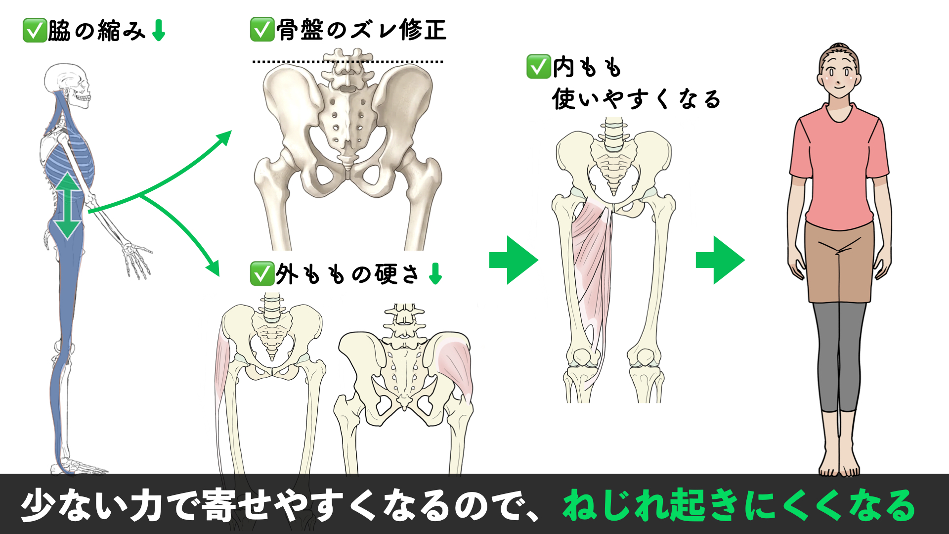 さらに、外腿やお尻の硬さのせいで内腿に力が入りづらかった分が解消されるので、結果的に足が真っ直ぐ寄せやすくなるということなんですね。