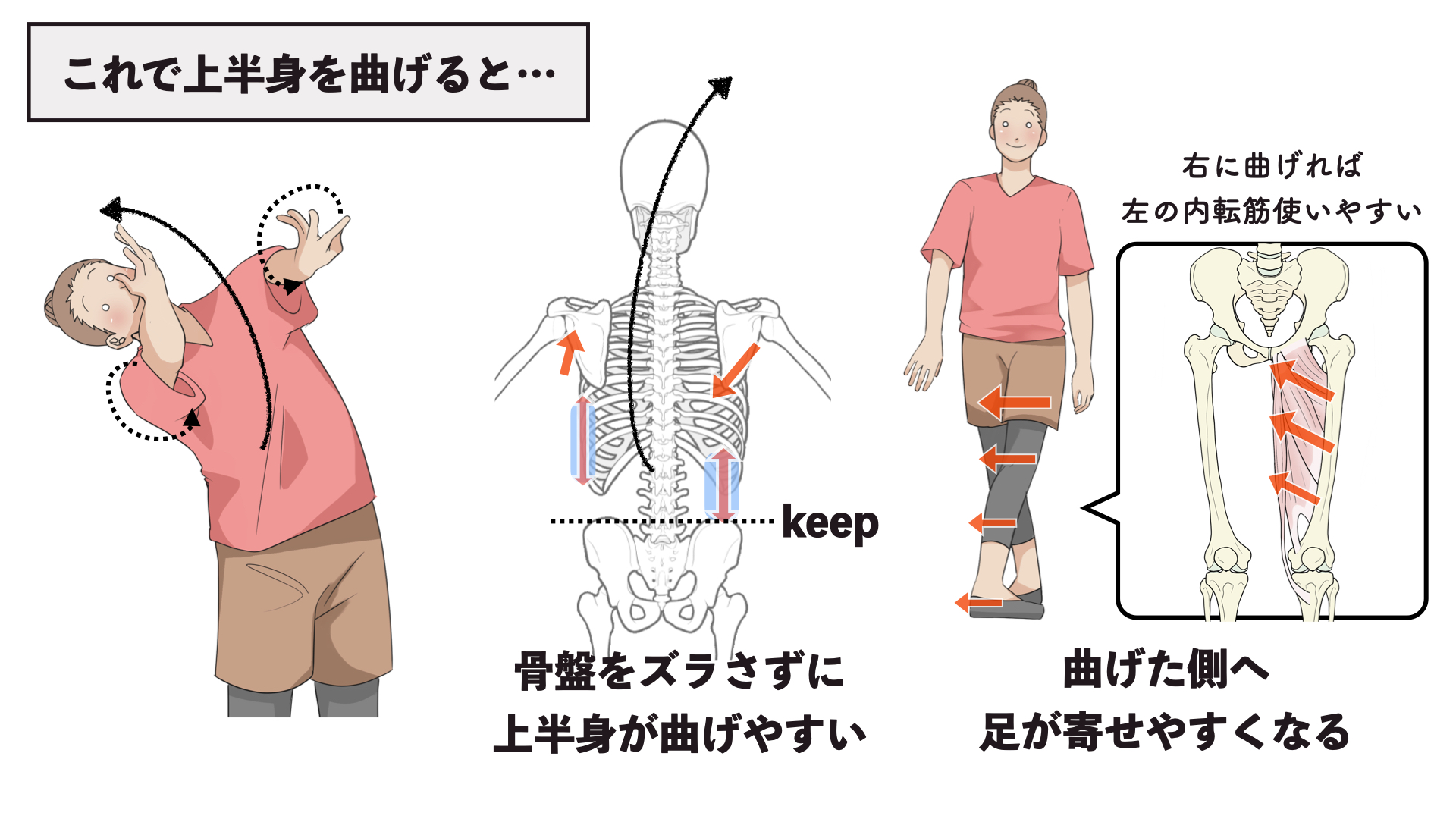 右に曲げれば左の内もも(内転筋)が使いやすくなって脚が寄せやすいです。また、左に曲げれば右の内ももが使いやすくなって脚が寄せやすくなります。