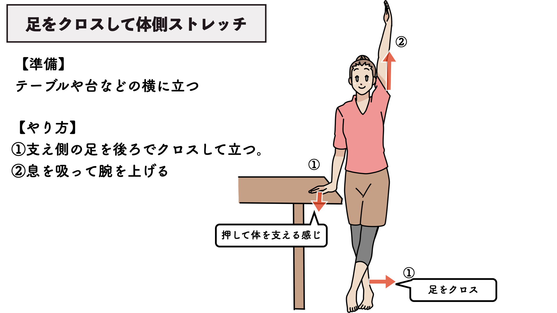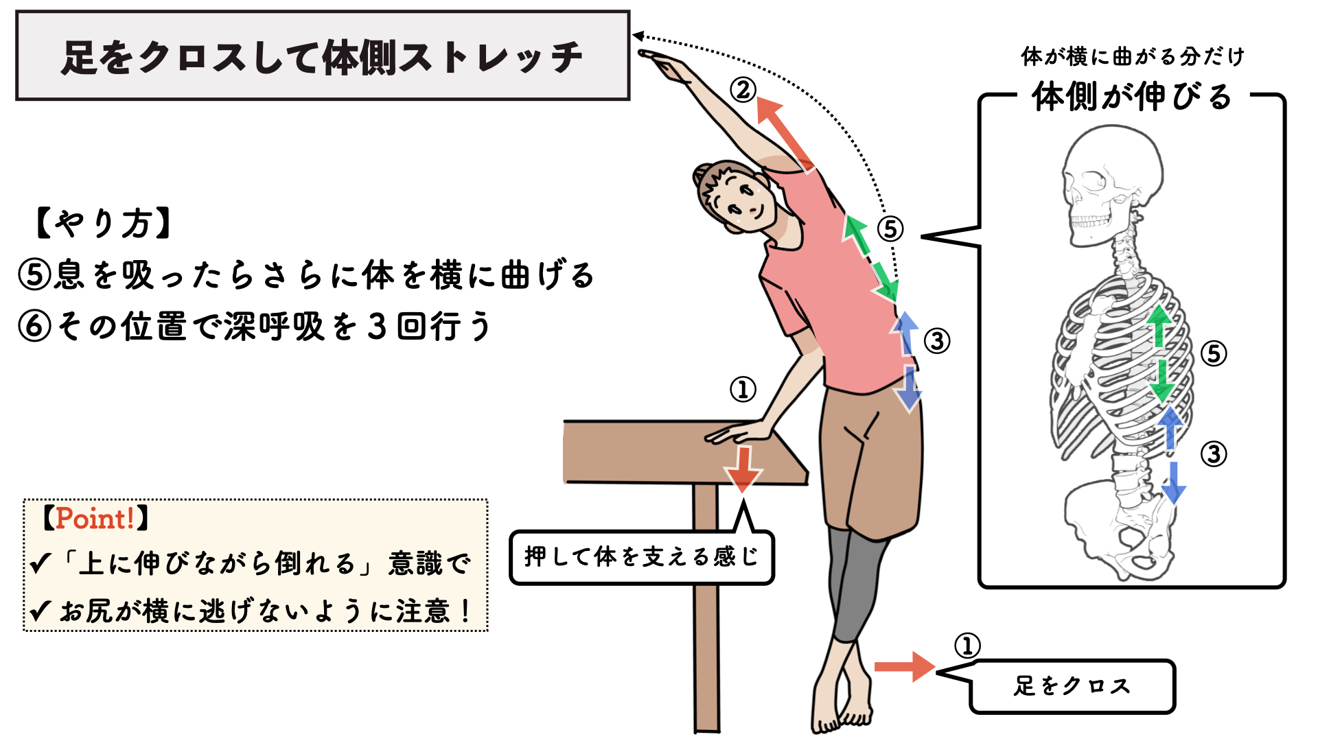 ②息を吸って手を上下に伸ばします。支え側は台を押して体を支える感じに
