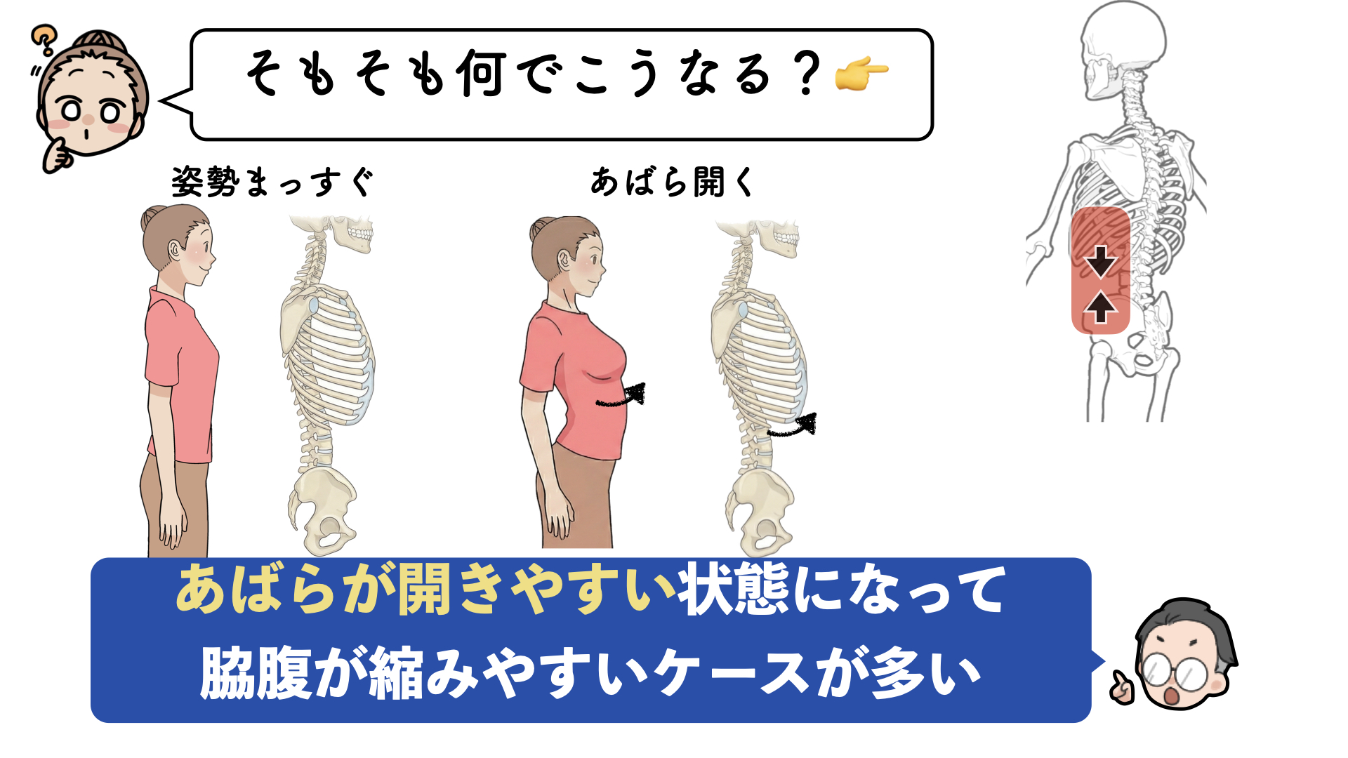 この原因には、あばらが開きやすい状態になっていて、肋間や脇腹が硬くなったり、腹筋が使いづらくなることで脇腹が縮みやすくなるみたいなケースも多いわけです。