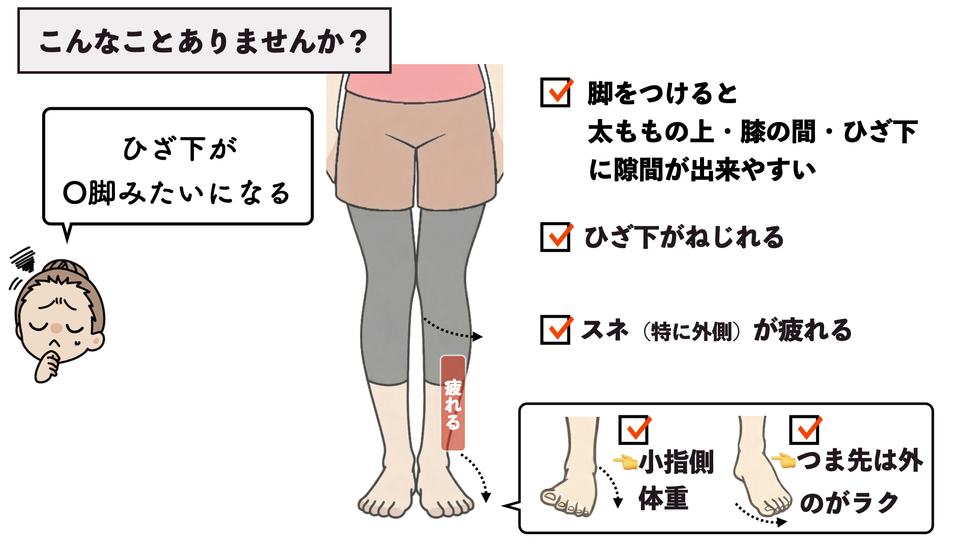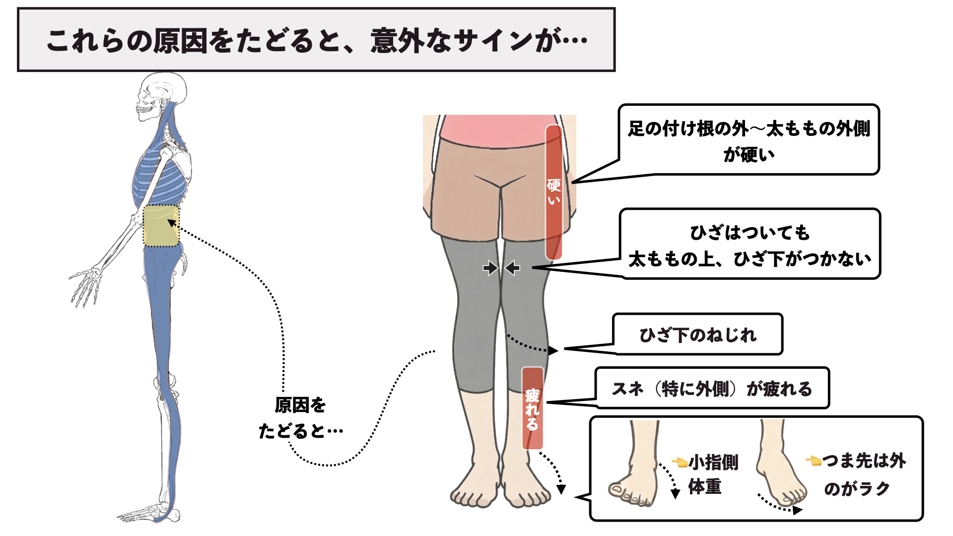 それが外ももが張ってしまう問題だったり、すねの外側が疲れやすかったり、小指体重とか、つま先が外に行きやすいなんかが、関連して出てくるというわけなんです。