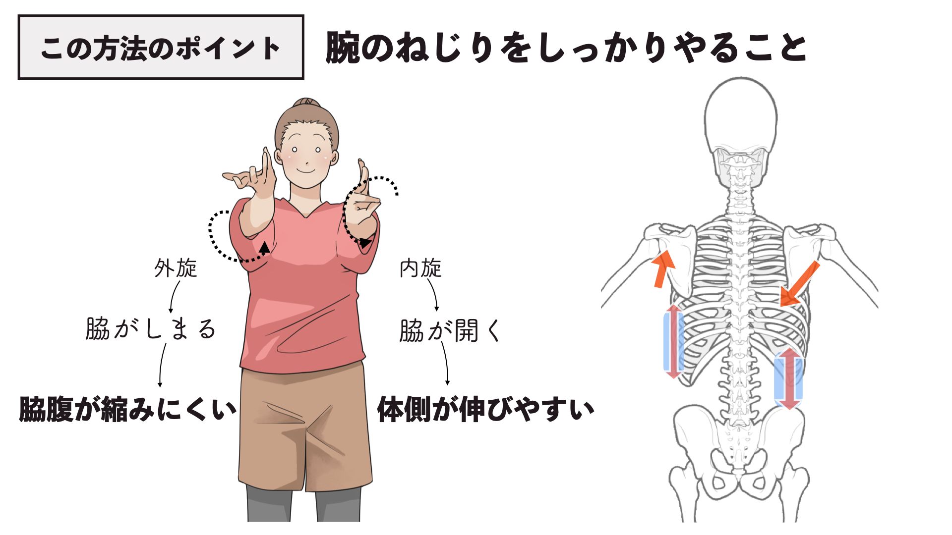 腕を外側にねじると脇が締まってくるので、脇腹が縮みにくい状態を作ることができます。