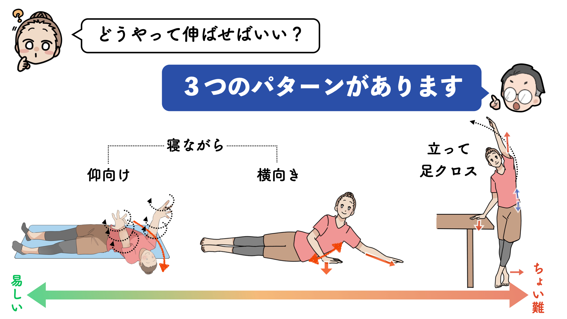 やり方は3つ紹介しますが、やるのはどれか1つで構いません。 ご自身の今の状態でやりやすいものとか、日常生活に取り入れやすいものを使っていただくと良いかなと思います。