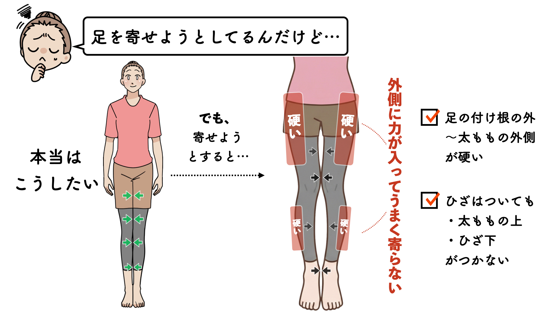 - 内ももが弱くて外ももが張っていることによって、足をまっすぐ寄せづらくなります。