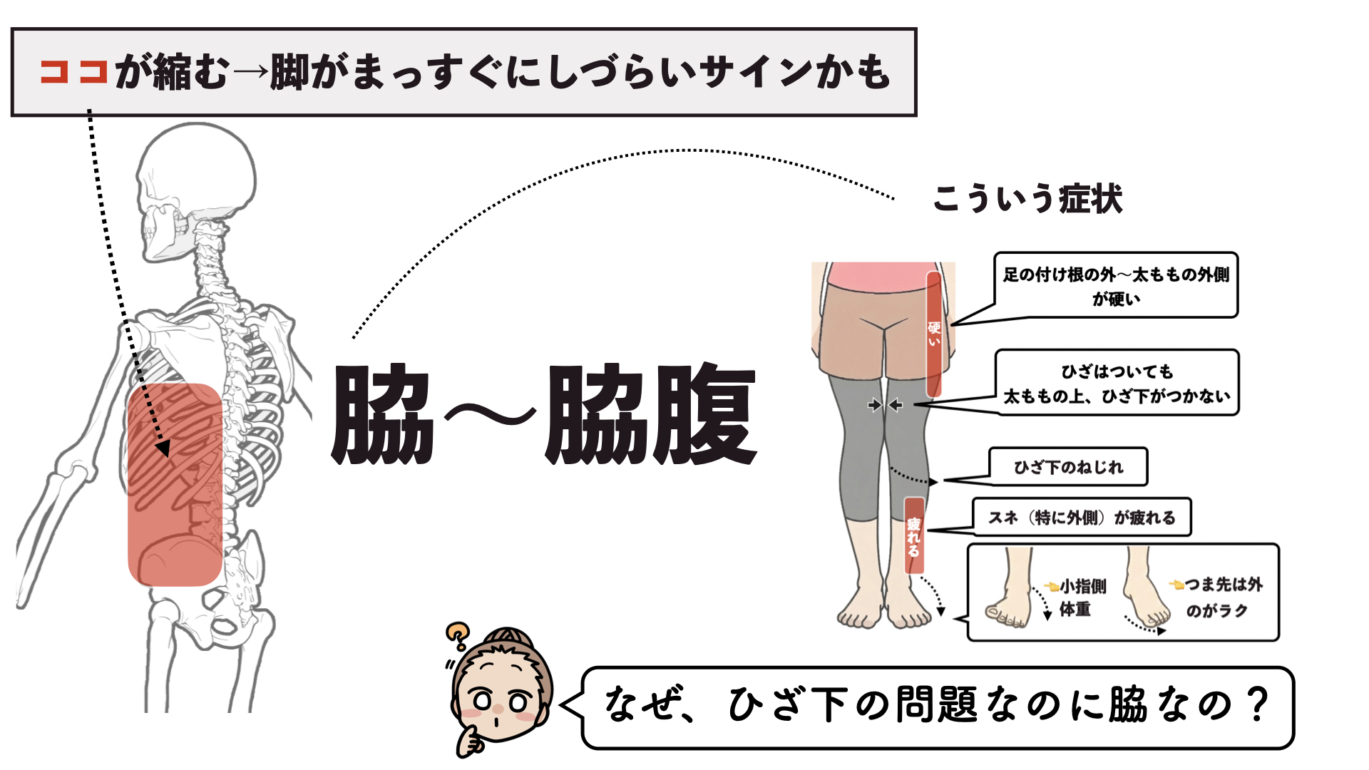 脇腹の縮みが、『脚の寄せづらさ』や『ひざ下』に影響するメカニズム