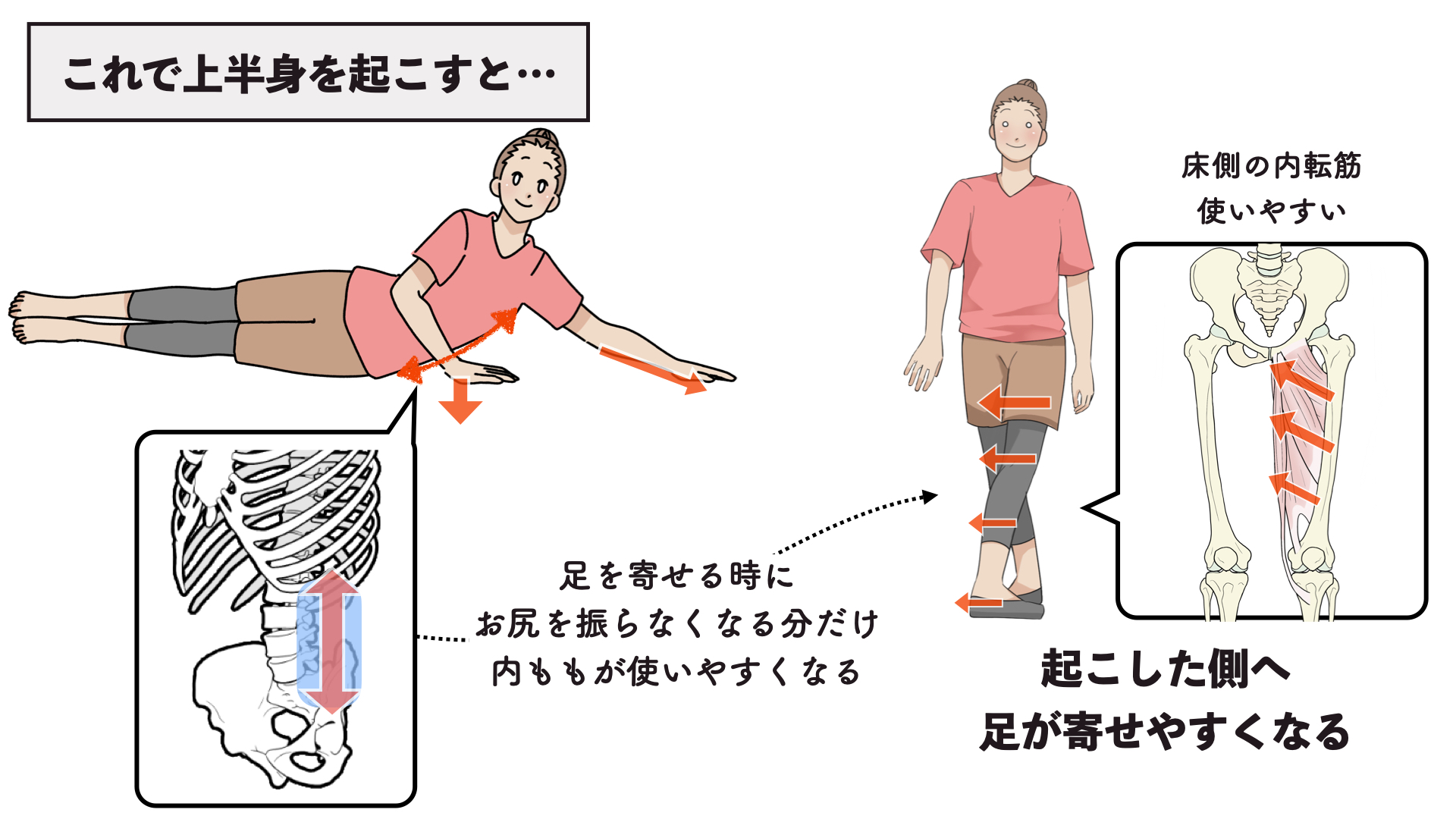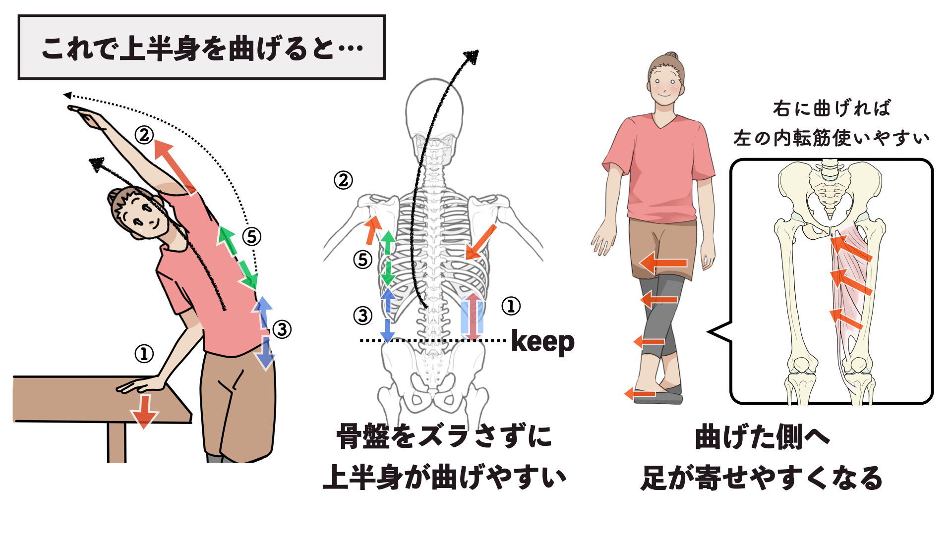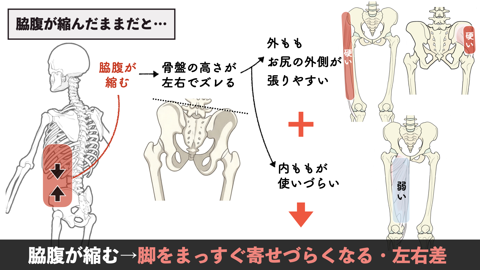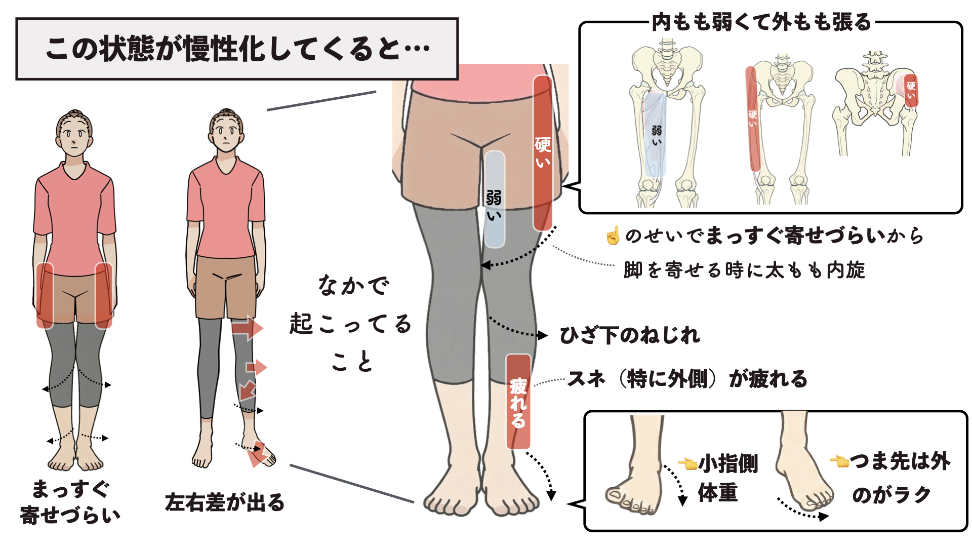 その影響で内ももは使いづらい感じになるので…これらが合わさって、足をまっすぐ寄せづらくなったり、人によっては左右差につながってきたりするんですね。