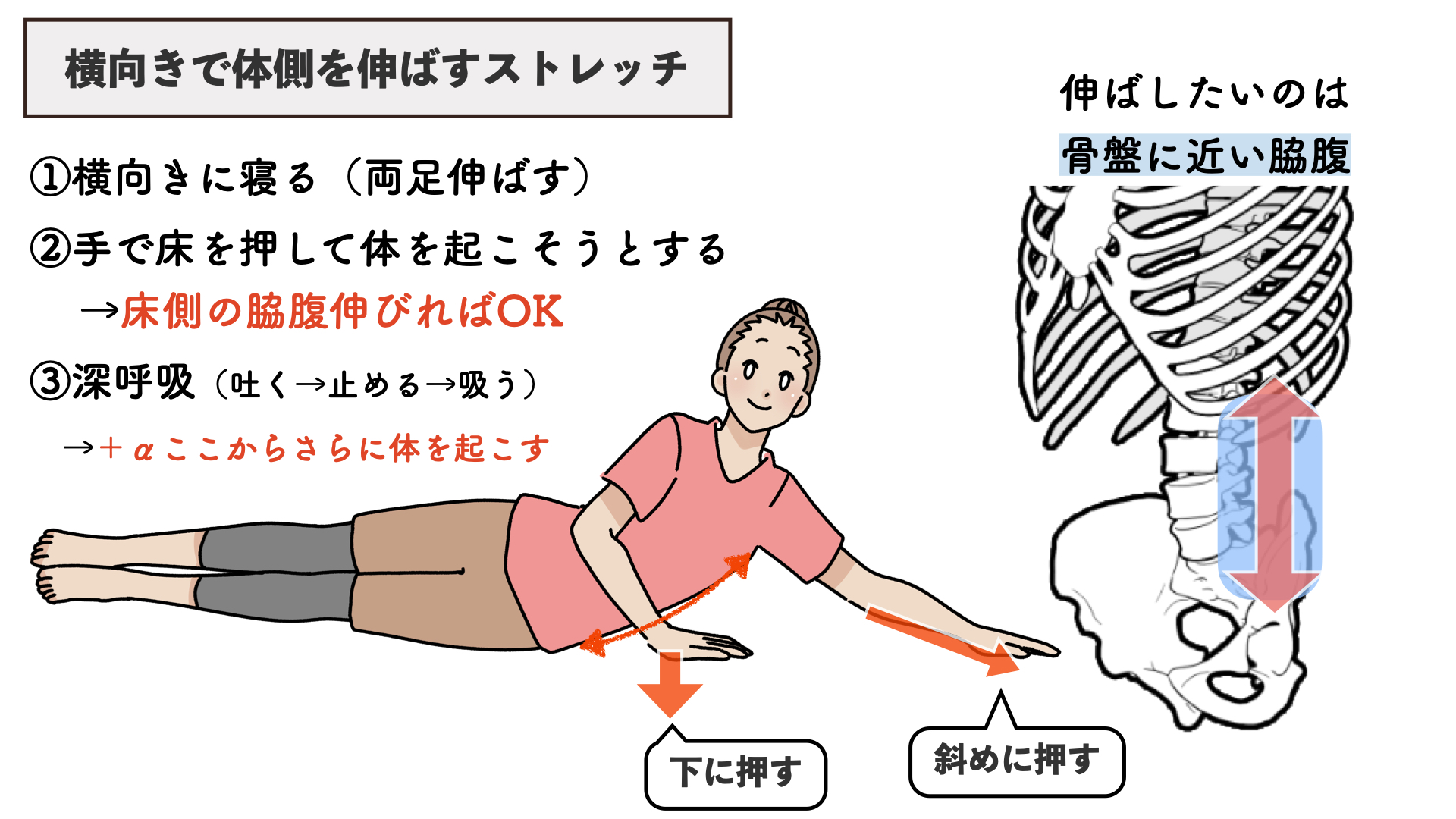 この時、床側の脇腹(特に肋骨と骨盤の間の部分)が伸びればOKです。