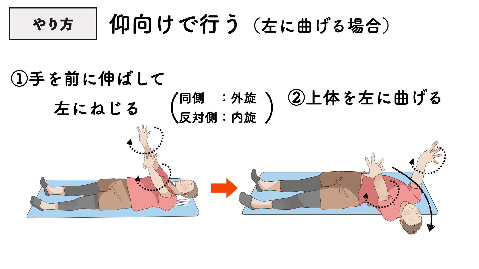 ①仰向けに寝て、 手を前に伸ばして腕を左にねじります。(左側は外側にねじる感じ、右側は内側にねじる感じ)