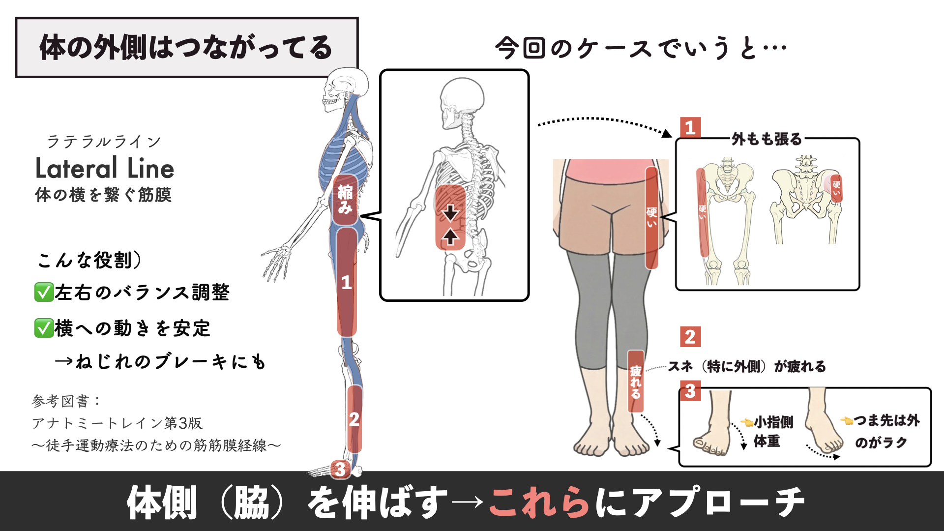 実は体の外側は、筋膜でつながっています。この筋膜がちゃんと働いてると、左右のバランス調整をしたり、横方向へのズレを抑えてくれるんですね。
