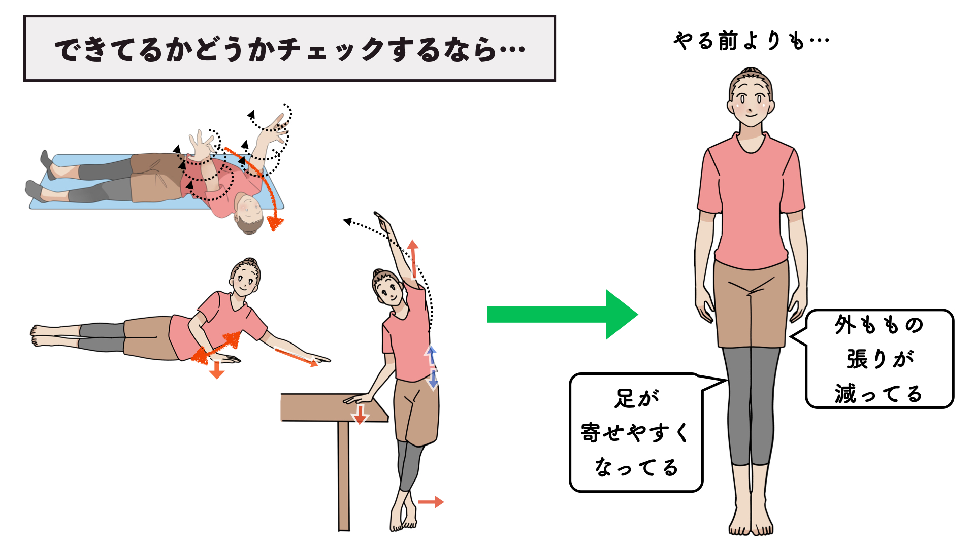 それぞれで体側を伸ばしてあげることによって、外ももの張りが減って足がまっすぐ寄せやすくなります。