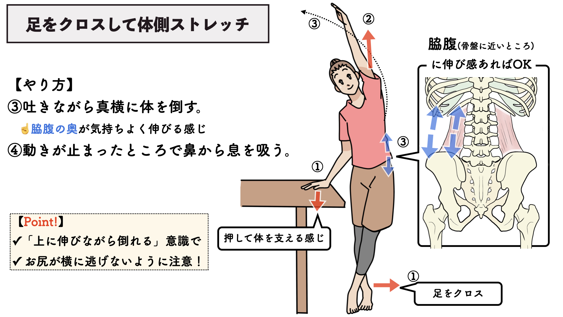③息を吐きながら真横に体を倒していきます。