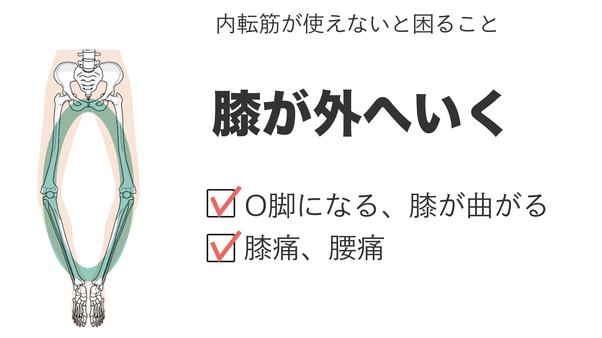 - 膝が外へ行くのでO脚の原因に
